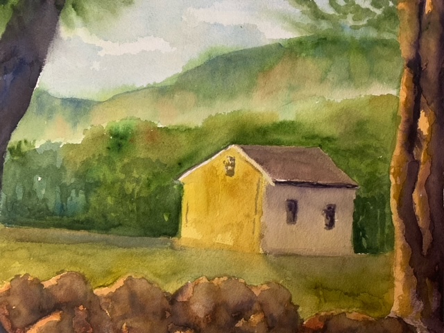 Sunny Sunday ~ Susan Hennelly ~ Watercolor ~ 16×20 ~ $350 ~ I missed the blue sky in my painting at the Sunday Plein Air event. This is a composite from photos that I took that day; painted in my studio. The old poplar and store are still standing. Click here to buy.