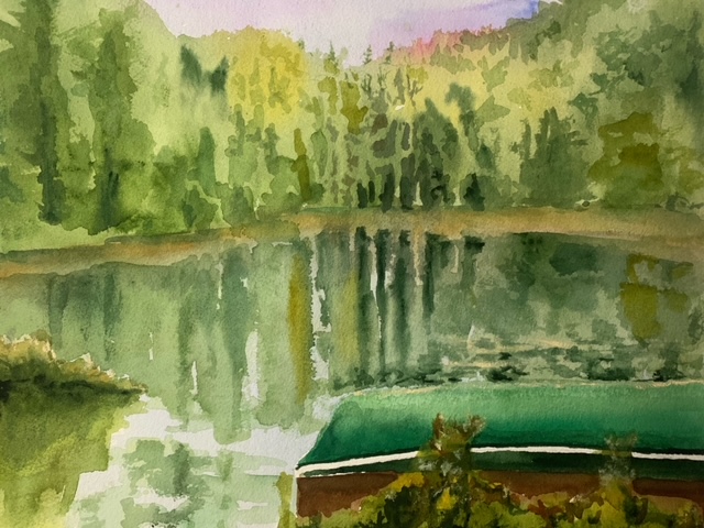 Canoe at Ray Lake ~ Alan Lewis ~ Watercolor ~ 11×14 ~ $150 ~ The Great Swamp offers many places of beauty that inspire art, and capturing some of it and presenting it is an honor. Click here to buy.