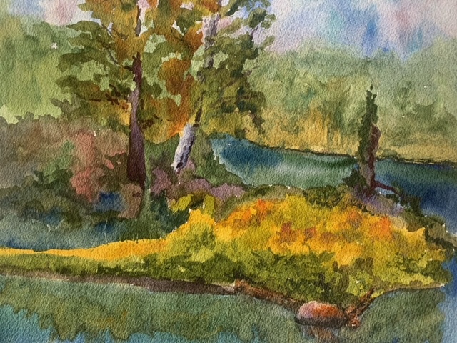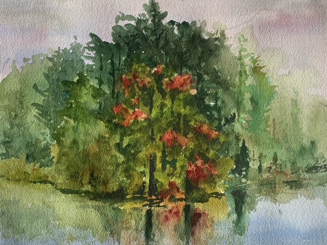 Island at Ray Lake ~ Alan Lewis ~ Watercolor ~ 11×14 ~ $150 ~ The Great Swamp offers many places of beauty that inspire art, and capturing some of it and presenting it is an honor. Click here to buy.