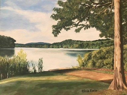 Reflecting ~ Alicia Earle ~ Acrylic ~ 11×14 ~ NFS/$65 prints ~ I chose to paint Putnam Lake for its natural beauty. It’s the town I’ve lived in my entire life. This view is by the boathouse at the south end near the dam. It is a popular fishing spot too. The location is serene, peaceful, and quiet: a nice place to reflect. Click here to buy.