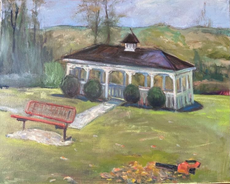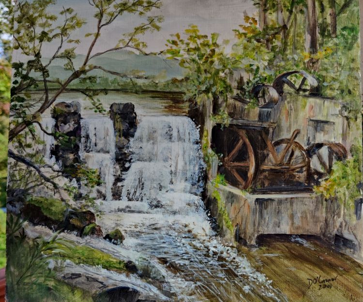 At Dover Furnace ~ Doreen O’Connor ~ Acrylic on birch panel ~ 13.5×15 ~ $250 ~ I set up to paint at the site of the Dover Furnace in gentle rain. The machinery from an old mill beside the waterfall caught my eye. Unfortunately, the rain and wind did not remain gentle. I lost my umbrella into the stream but could not get to it. I hope someone has been able to retrieve it down stream. Click here to buy.
