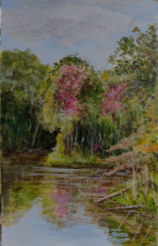 Swamp Trees ~ Doreen O’Connor ~ Acrylic on birch panel ~ 13×15 ~ $300 ~ I have been trying to find a safe (from rushing traffic) place to paint the swamp as it passes under rte 311 in Patterson. I went down a drive next to the Swamp and was given permission to paint the dying swamp trees through the wall of greenery. Thanks to the home owner I have not found again. Click here to buy.