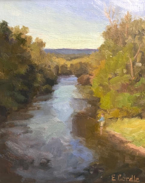 Ten Mile River ~ Erin Cordle ~ Oil Paint ~ 13.25×15.25 ~ $475 ~ Painted on location at the bridge over Ten Mile River in Wingdale, NY. I was inspired by the beautiful morning light looking up the river. Click here to buy.