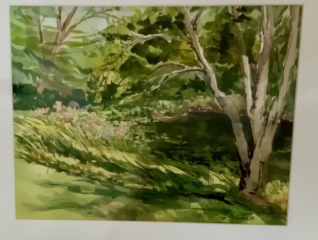 Marsh Edge ~ Judy Kelley-Moberg ~ Watercolor ~ 12×16 ~ $85 ~ From the deep shade of the trail in Patterson’s Clough Preserve your eyes transition to the sunlit marsh whose waters slip under the Rail Trail to feed Ice Pond. Click here to buy.