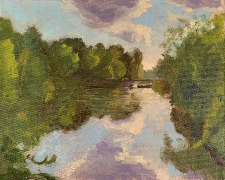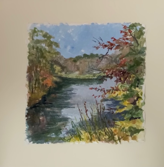 Beautiful Evening ~ Jeanne Plekon ~ Oil Paint ~ 13×15 ~ $250 ~ Captured late afternoon light on a day the clouds parted and we saw blue sky again. Foliage was just beginning to turn, almost minute by minute as we painted. At divergent reservoir bridge in Brewster, aka East Branch Croton River; painting with FrOGS. Click here to buy.