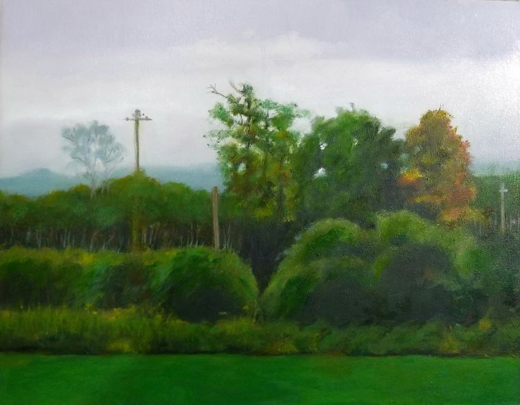 GS Watershed ~ Gysela Pacheco ~ Oil on Panel ~ 14×11 ~ $224 ~ Plein Air session with the GS/Public Library. I chose this copse of trees with its foggy backdrop to paint, because on a rainy day of dark muted colors, it showed the first changes of the coming season. Click here to buy.