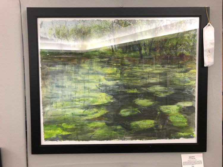 Waterlilies ~ Anne Bander ~ Watercolor on Arches paper ~ 36×24 ~ $345 ~ I took a photo on the east Branch of the Croton River and made many attempts to capture the light, the waterlilies floating in light in darkness. It remains in my mind’s eye so clearly, the inky depth both dark and transparent. This year I took a different approach using 30×22 arches 300lb paper and making liberal use of splatter, multiple washes and opaque white gouache to convey light, darkness and distance. I hope it goes some way toward expressing my delight and wonder in this and other places in the wetlands. Click here to buy.