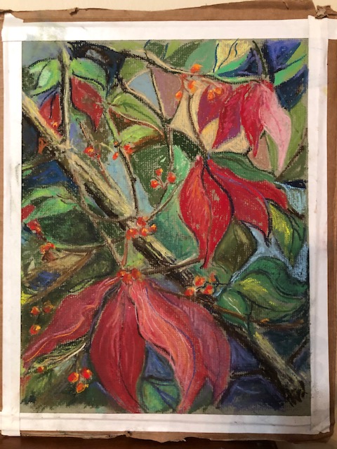 Invasives ~ Judy Kelley-Moberg ~ Pastel ~ 14×18 ~ $100 ~ The beautiful colors and textures of burning bush and bittersweet along Mill Brook in Patterson distract us as they choke out our native species. Click here to buy.