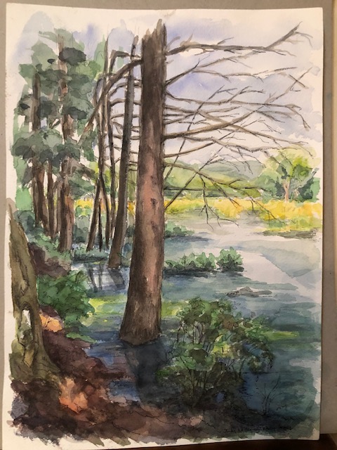 Turning Trees at Ray Lake ~ Alan Lewis ~ Watercolor ~ 11×14 ~ $150 ~ The Great Swamp offers many places of beauty that inspire art, and capturing some of it and presenting it is an honor. Click here to buy.