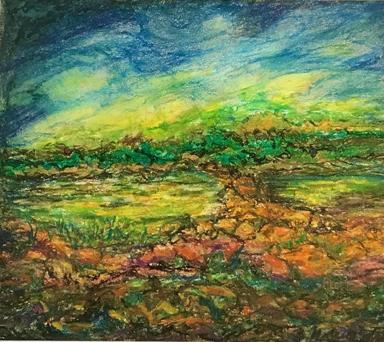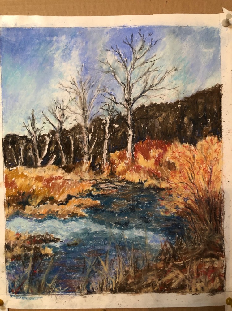 The Pond ~ Judy Kelley-Moberg ~ Pastel ~ 16×20 ~ $150 ~ The colors of the fall sky are caught in the water of a small beaver pond in Great Hollow Preserve before Quaker Brook becomes Haviland Hollow Brook on its way to the Great Swamp in Patterson. Click here to buy.
