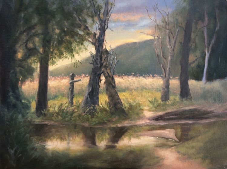 Old Friends at A.T. Crossing of Swamp River ~ Karen Maloof ~ Oil on Panel ~ 17×21 ~ $675 ~ A pair of dead trees creates a support for each other after decades of growing next to each other. In their final embrace, they will continue to nourish the life of the swamp surrounding them. Click here to buy.