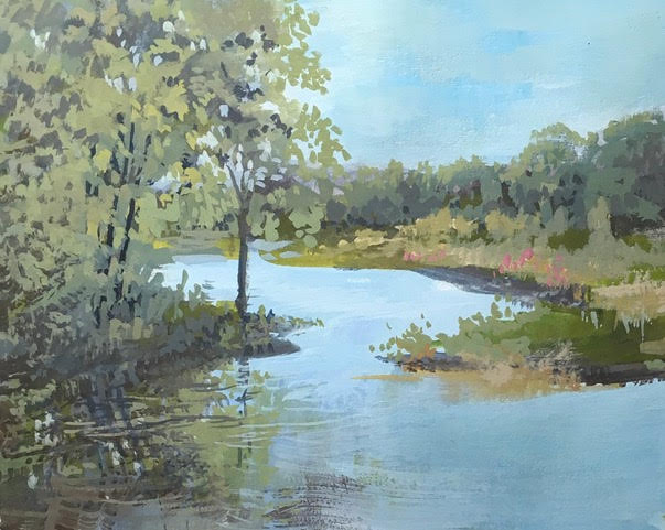 Swamp Maples ~ Doreen O’Connor ~ Acrylic on birch panel ~ 12.5×15 ~ $250 ~ As I arrived at the paint-out at the Patterson Library grounds on a dull, cloudy day, I was glad to find that the swamp trees were turning red and gold behind the wall of green with some golden rod. I had a scene with interest. Click here to buy.
