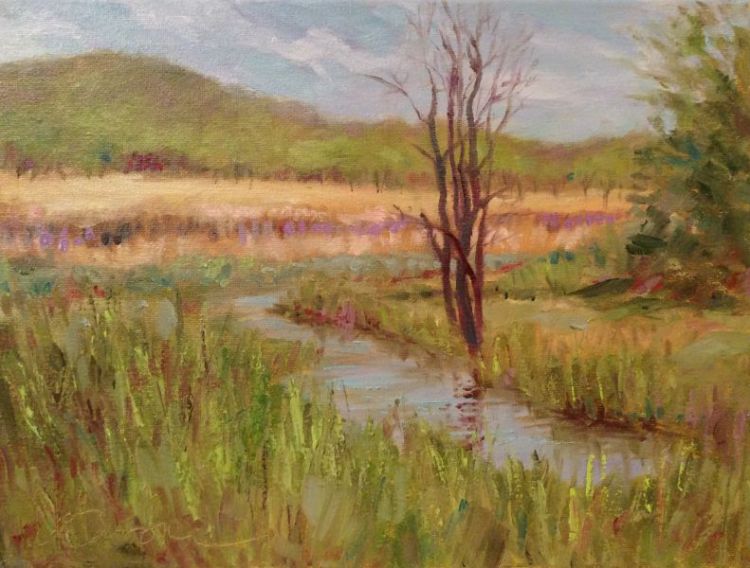 Spring Forward ~ Leslie Carone ~ Oil ~ 9×12 ~ $375 ~ It’s early spring, the swamp is beginning to “green up”, and the air is filled with the sound buzzing insects and birdsong. Acres of heaven, and I’m in the middle of it. Click here to buy.