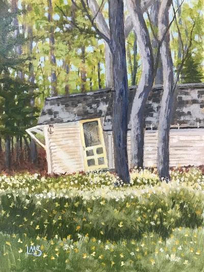 Spring Explosion ~ Lynn Slonaker ~ Gouache ~ 9×12 ~ $150 ~ Each spring the explosion of daffodils taking over the entire front of this vintage, sagging cottage calls out to me to be painted. So I did. (Briggs Hill Rd, Sherman, CT). Click here to buy.