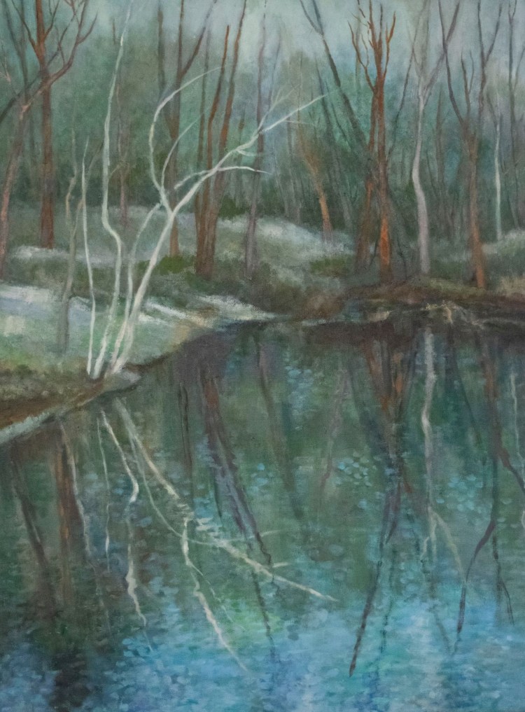 Spring Thaw ~ Marilyn Price ~ Oil Paint ~ 19×25 ~ $2,500 ~ I was inspired by the serenity and calm of the scene of the great swamp from photos taken for me as I could no longer paint directly on location. I was particularly drawn to the beauty of the reflections. Click here to buy.