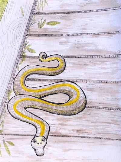 Ribbon Snake ~ Mikel Alian ~ Watercolor and Pen ~ 5.5×8.5 ~ $50 ~ This Eastern Ribbon Snake was hanging on the boardwalk near the Great Swamp. These snakes are semi-aquatic and often hang near a shoreline, a reminder to appreciate life in liminal spaces. Click here to buy.