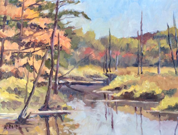 Passing Clouds over the Swamp ~ Ned Reade ~ Oil Paint ~ 12×16 ~ $275 ~ I enjoy the painting at the Zaengle Preserve along River Rd in Pawling. Morning light or afternoon light make the fall colors sparkle. I love hearing the spash of a fish, or the “whoop, whoop” of a crane or egret along the edge of the water. This place for me is like the waterlilies were for Monet! Click here to buy.