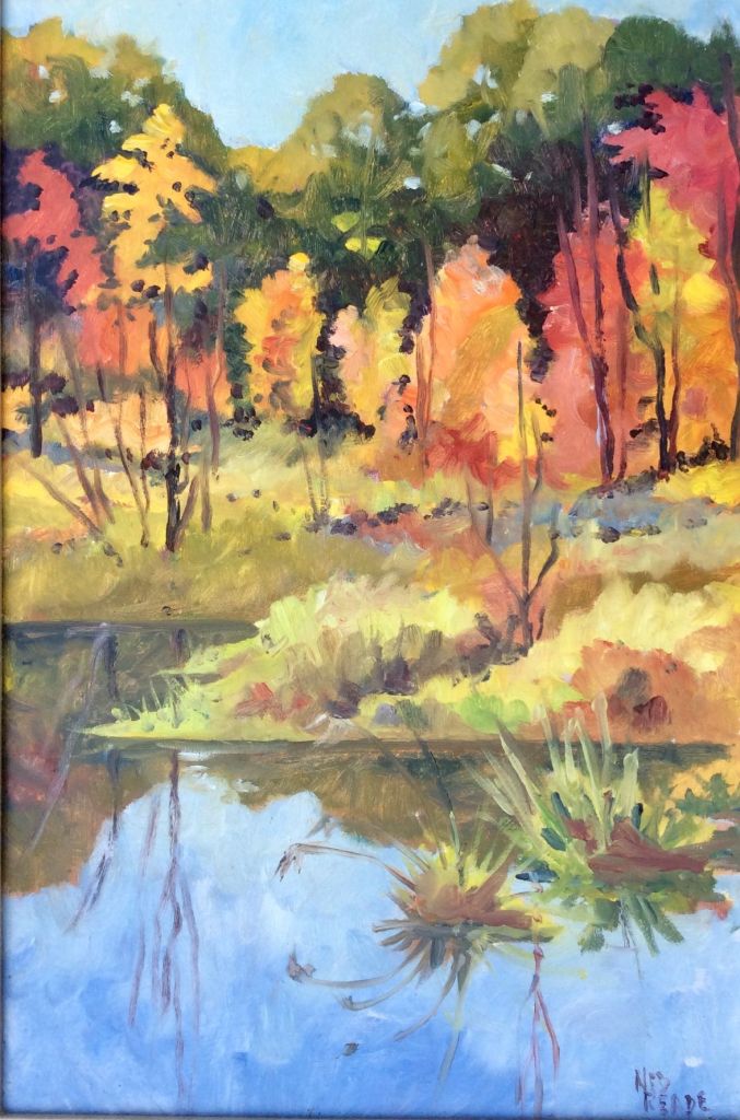 Two Tufts ~ Ned Reade ~ Oil Paint ~ 12×18 ~ $275 ~ I enjoy the painting at the Zaengle Preserve along River Rd in Pawling. Morning light or afternoon light make the fall colors sparkle. I love hearing the spash of a fish, or the “whoop, whoop” of a crane or egret along the edge of the water. This place for me is like the waterlilies were for Monet! Click here to buy.