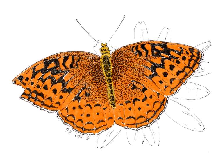 Aphrodite Fritillary ~ Paul Kmiotek ~ Ink ~ 5×7 ~ $90 ~ My family and I enjoy hiking the many trails in and around the Great Swamp. I often stop to take pictures of the various wildlife we encounter for potential drawings. Insects are often overlooked as the subjects of artwork, but I find them to be fascinating and beautiful. [SOLD]