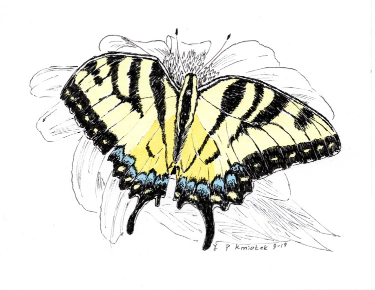 Eastern Tiger Swallowtail ~ Paul Kmiotek ~ Ink ~ 5×7 ~ $90 ~ My family and I enjoy hiking the many trails in and around the Great Swamp. I often stop to take pictures of the various wildlife we encounter for potential drawings. Insects are often overlooked as the subjects of artwork, but I find them to be fascinating and beautiful. [SOLD]