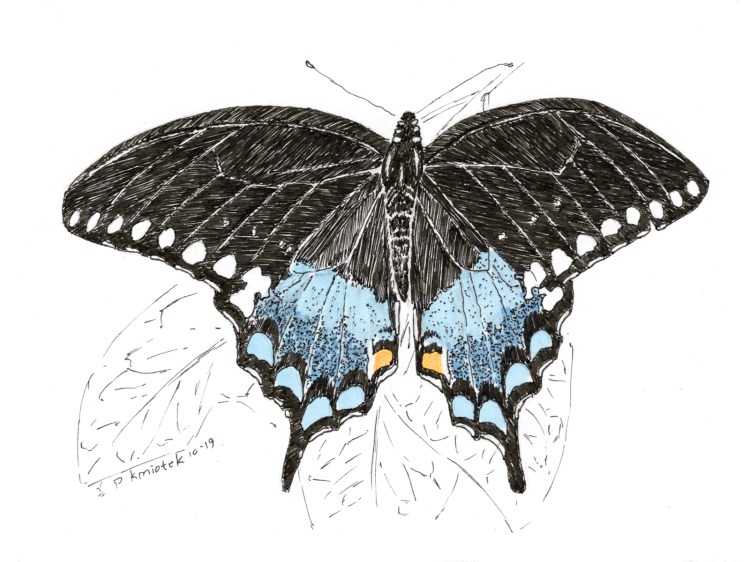 Spicebush Swallowtail ~ Paul Kmiotek ~ Ink ~ 5×7 ~ $90 ~ My family and I enjoy hiking the many trails in and around the Great Swamp. I often stop to take pictures of the various wildlife we encounter for potential drawings. Insects are often overlooked as the subjects of artwork, but I find them to be fascinating and beautiful. [SOLD]