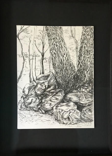 Arbio Petrobios, Great Hollow ~ Sharon Nakazato ~ Pen and Ink ~ 19×14 ~ $235 ~ It’s fascinating how the life stories of trees and rocks are written in their physical aspects. A powerful tree with two strong trunks growing together out of the roots like this one would be called a “wife-husband tree” in Japan and many are especially revered. Click here to buy.