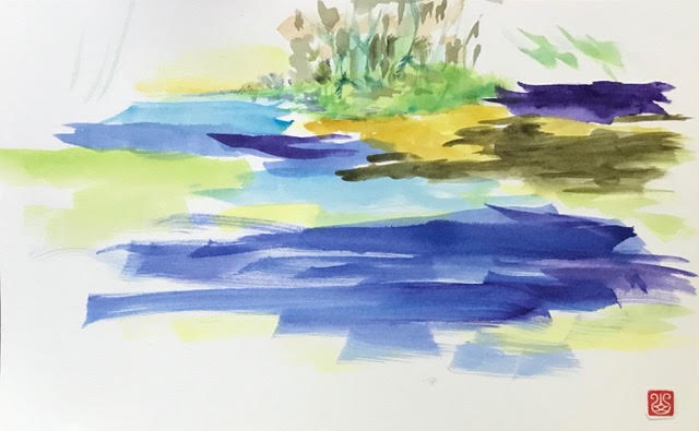 The Little Pond ~ Susan Hennelly ~ Watercolor ~ 14×17 ~ $200 ~ The view from my house. Loved the reflections on the pond so still yet flowing down to the big pond and on down to Seven Wells Brook going to 10 Mile River in Dover. Click here to buy.