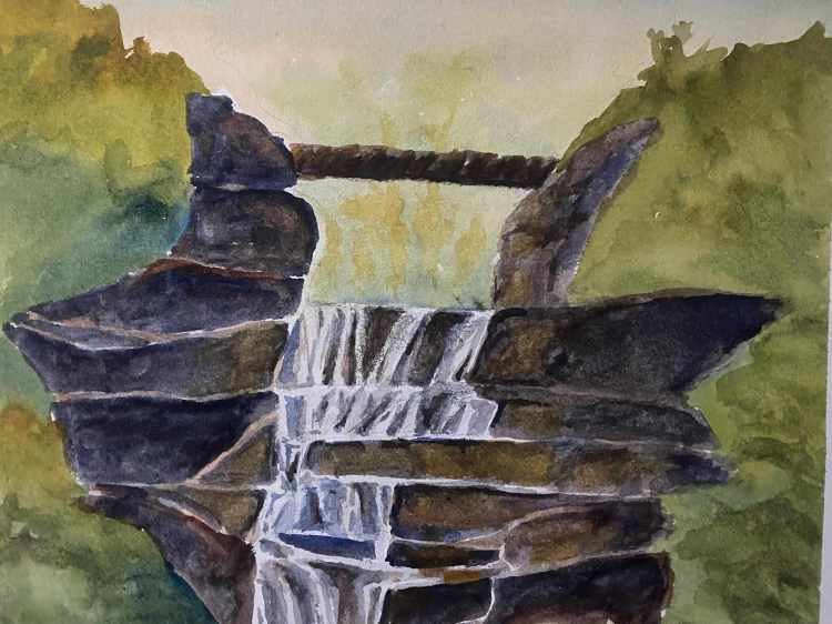 Alan Lewis ~ Footbridge at Ray Lake ~ Watercolor ~ 11×14 ~ $150 ~ In this painting I eliminated the detail of the trees and vegetation on the sides in order to focus on the cascading stream and the rocks it falls upon, while the bridge anchors the scene from the top.