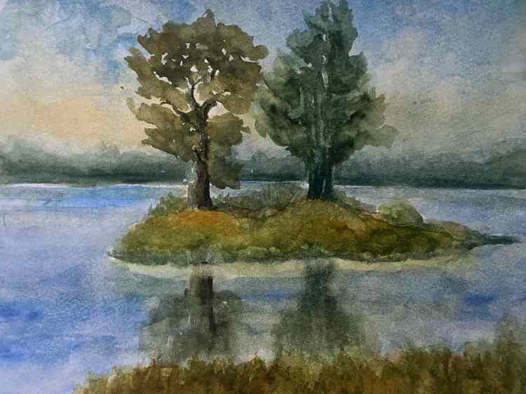 Alan Lewis ~ Island at Ray Lake ~ Watercolor ~ 11×14 ~ $150 ~ In this painting I placed less emphasis on the trees on the far side of the lake to better feature the trees and vegetation on the island, and their reflections.
