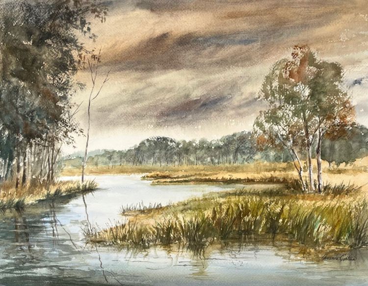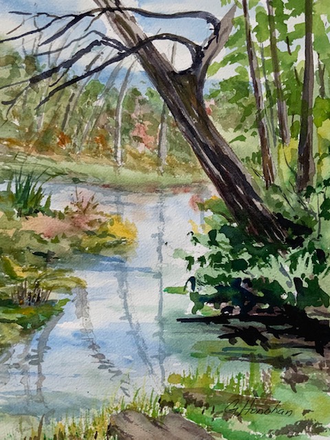 Georgine Honohan ~ A Bend in the River ~ Watercolor ~ 12×16 ~ $275 ~ Painted thinking about the peace and freshness that the Great Swamp offers to all who visit. I remembered many happy hours deep in the Swamp in a canoe, soaking up the sparkle of the water the lush green plants and the surprising joy of spotting the wildlife.