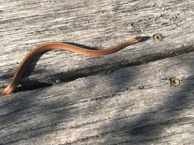 Bella Dalton-Fenkl ~ DeKays Brown snake on the Boardwalk ~ Photograph ~ 10×8 ~ $200 ~ My first time photographing a DeKay’s! Screws in the bridge crossing Swamp River give a sense of scale, and despite how small this snake is, it is a full-grown adult. I love the heart-shaped mark on the head and the sun bringing out the red tones in its brown scales.