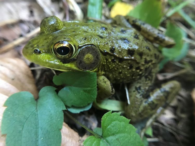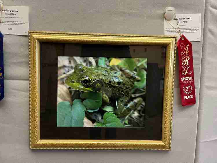 Bella Dalton-Fenkl ~ Green Frog ~ Photograph ~ 10×8 ~ $245 ~ This frog leaped onto the side of the trail in Clough Preserve, then waited to have its portrait snapped. I love the subtle blue highlights on its wet body as it reflects the sky above, and the way it’s pressed up against the leaf as if it’s holding a bouquet.