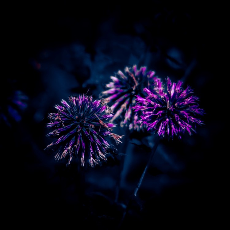 “Carlos Passi ~ Globe Thistles in the Eyes of a Bee ~ Photograph ~ 10×10 ~ $125 ~ Bees are trichromatic, with three types of color receptors in their eyes. These photoreceptor cells are sensitive to ultraviolet (UV), blue, and green wavelengths of light. This allows bees to see a range of colors beyond what humans can perceive. They are especially sensitive to UV light, which is invisible to humans. Bees have a relatively limited color spectrum compared to humans. They are thought to be unable to distinguish between red and certain shades of orange and yellow, as these colors appear somewhat similar to them due to their limited red sensitivity. (Taplow Blue Globe Thistle – Echinops bannaticus)”