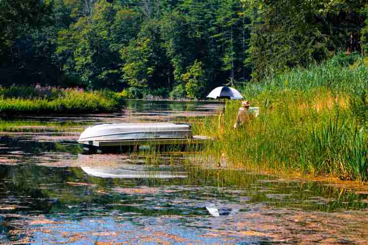 Daisy de Puthod ~ Quiet Launch ~ Oil ~ 12×24 ~ $1200 ~ Quiet Launch was started on location, en plein air, with my friend Doreen O’Connor and finished later in the studio. The location of the scene is at the end of Marble Road, the Great Swamp Canoe/Kayak Launch.”