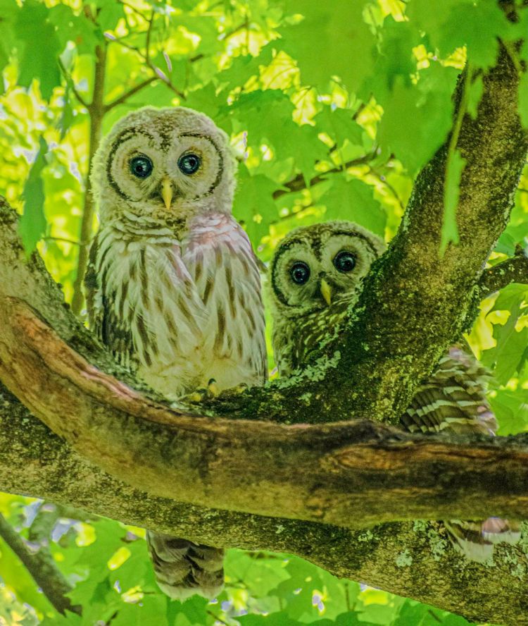Claudia J Griswold ~ Peekaboo Owls ~ Photograph ~ 18×22 ~ $200 ~ I have never seen an owl that close up, no less two juveniles. They were as curious about me as I was about them. We spent a short spell together, before they flew off further into the Great Swamp In Patterson.