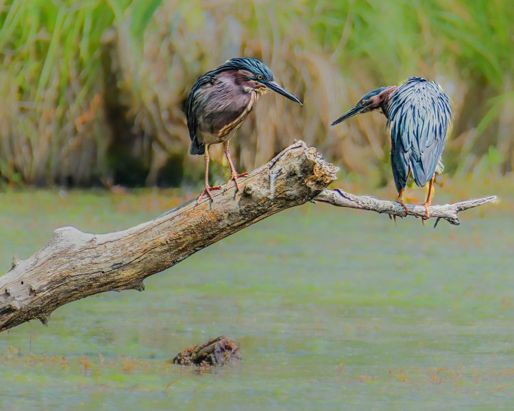 Claudia J Griswold ~ Green Heron Courting ~ Photograph ~ 11×14 ~ $125 ~ This pair of Green Herons were in very dense vegetation along the shore of Little Pond. Difficult to find a clear view, the noise spooked them. They flew unto this log and I had my shot. I will definitely be back as it is very serene.