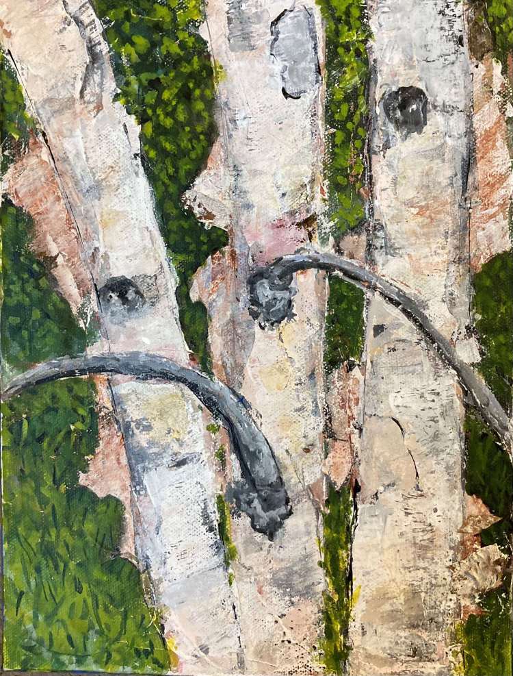 Cynthia Katz ~ Native River Birch ~ Mixed Media ~ 9×12 ~ $275 ~ The peeling bark of the birch trees intrigued me. So I highlighted them for this painting.