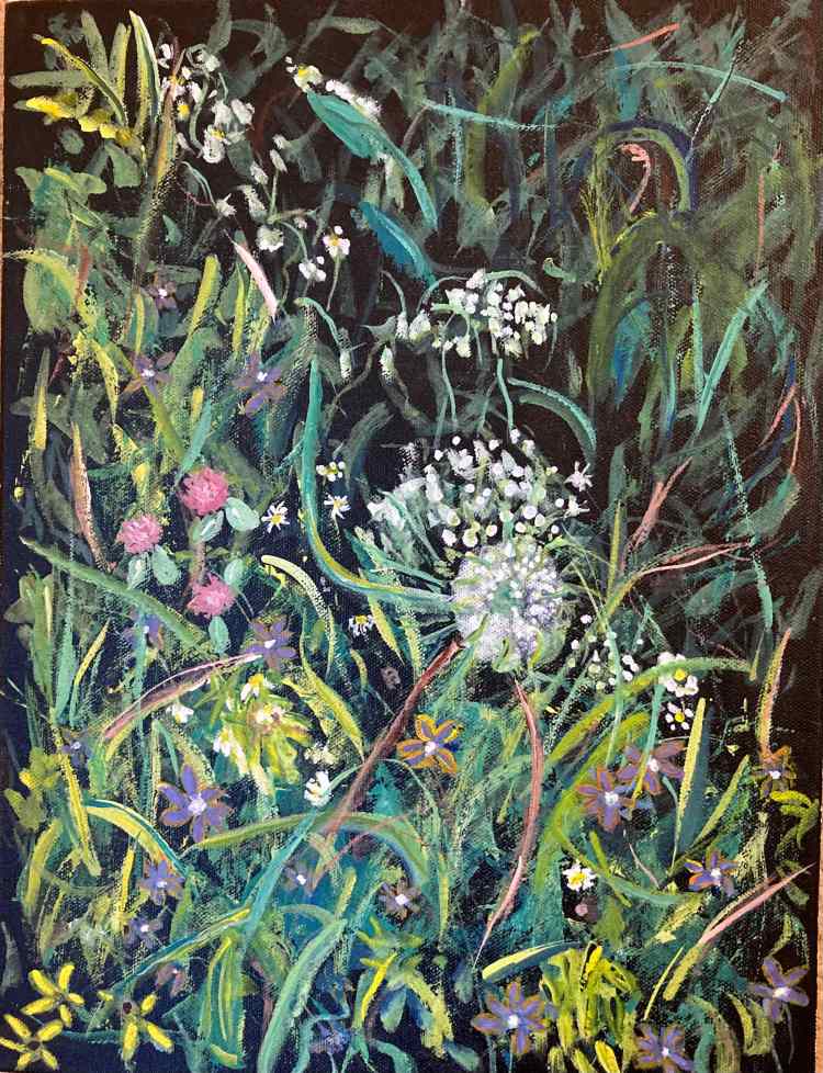 Cynthia Katz ~ Wildflowers ~ Mixed Media ~ 12×16 ~ $325 ~ There’s a great variety of wildflowers that grow on the hillside. I chose to include: Queen Anne’s Lace, Chickory, Clover Purple Flowers, Fleabane – tiny daisies, and a few others.