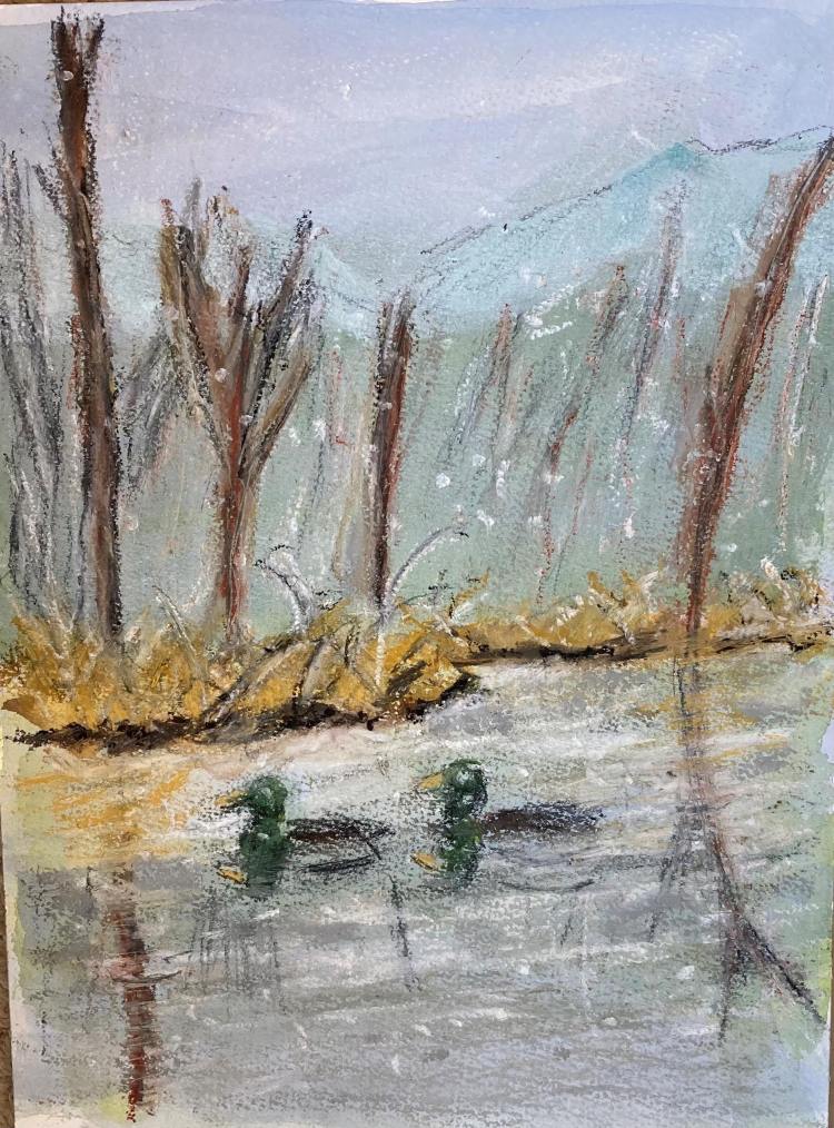 “Cynthia Katz ~ Winter day with ducks ~ Mixed Media ~ 9×12 ~ $275 ~ The challenge was to capture how bleak and chilly the day was in the swamp, with ducks going about their “ business as usual.” Wingdale, NY, Feb. 25, 2023, reference photo by Ken Luhman with his gracious permission. “