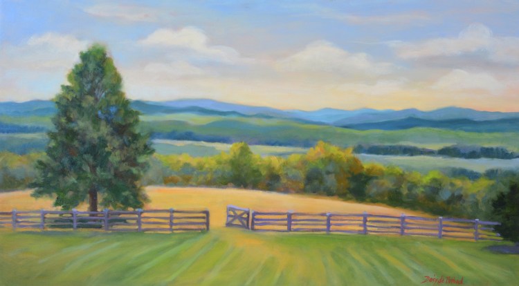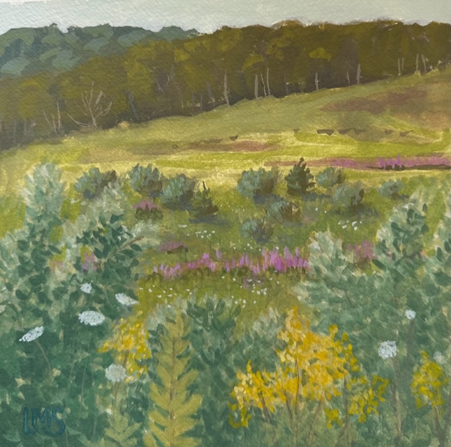 “Lynn Slonaker ~ View from Doreen’s ~ Gouache ~ 8×8 ~ $250 ~ Beautiful long view of fields and wildflowers in Wingdale”