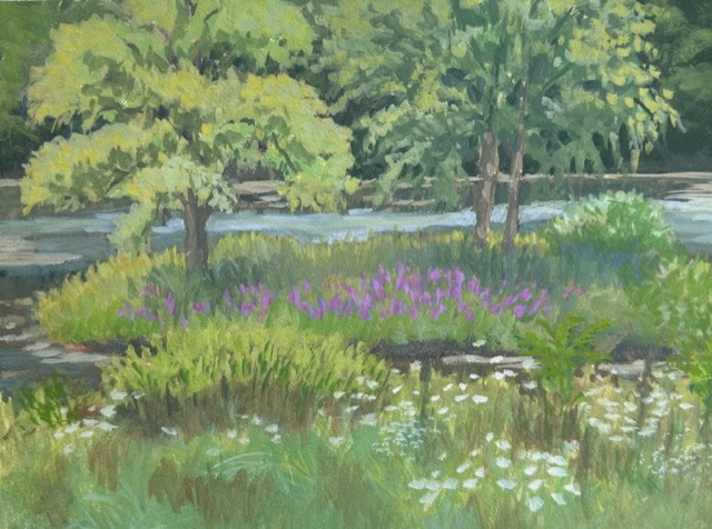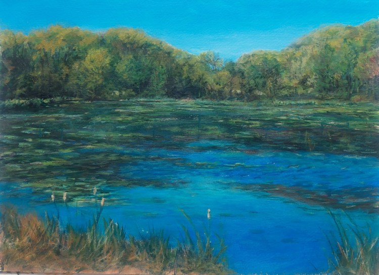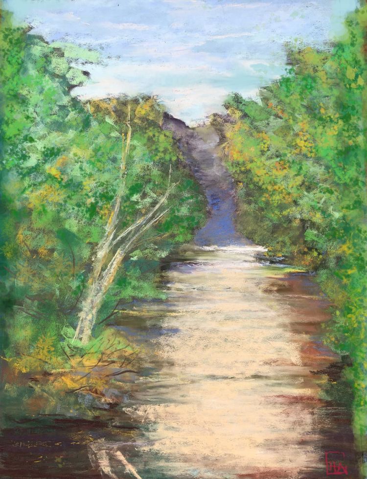 Gretchen Hoffmann Abene ~ Ten Mile River Webatuck ~ Mixed Media Pastel Digital Painting ~ 12×18 ~ $650 ~ “Ten Mile River” has held my fascination since re-locating right smack in the middle of the Great Swamp about 40 years ago. Ten Mile River in early August is the focus of my painting which began as a Pastel painting of this lovely spot just beyond the Webatuck bridge. I finished the painting digitally in Procreate and had it printed on aluminum. How wonderful it is to have been able to explore these historical surroundings as an artist/painter.