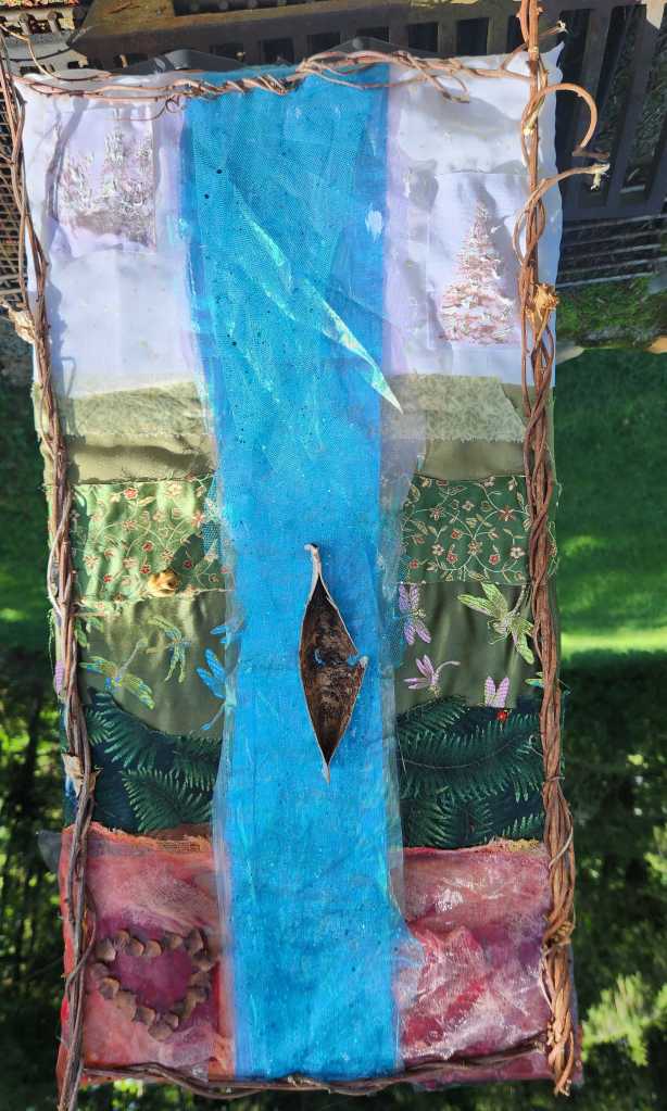 Donna Castelluccio ~ Peace ~ Mixed Media ~ 12×24 ~ $125 ~ Impression of the swamp in all seasons. Mostly fabric collage, birch bark canoe, a frog and ladybug if you look close…