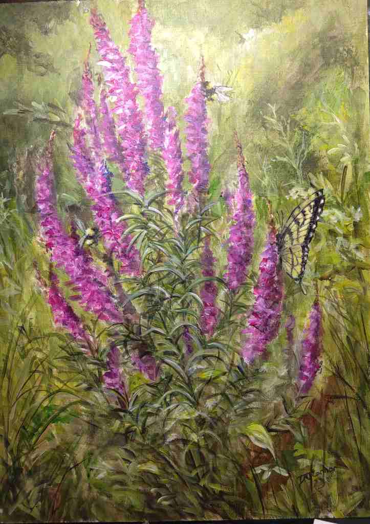 Doreen O’Connor ~ Loosestrife ~ Acrylic ~ 11×14 ~ $300 ~ Loosestrife is a highly invasive plant but it provides pollen for many insects and fills August low areas with beautiful magenta color.