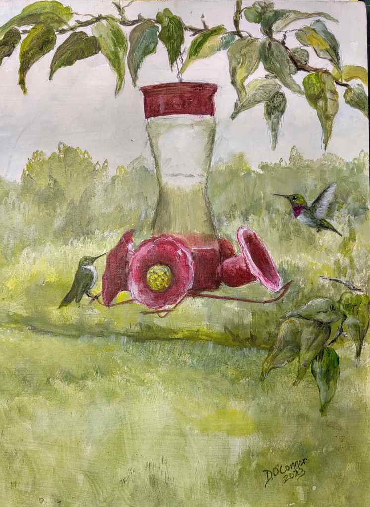 Doreen O’Connor ~ Sugar Water ~ Acrylic ~ 11×13 ~ $300 ~ At a Frogs paint out at my house in Wingdale, I couldn’t resist getting a close up of the hummingbirds at my feeder.
