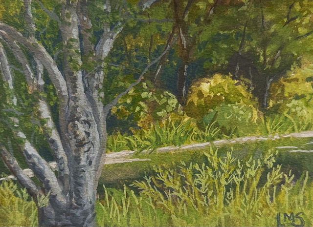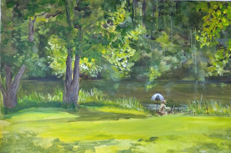 Doreen O’Connor ~ Sun Glow ~ Acrylic ~ 11×13 ~ $250 ~ Painting at Ray Lake in Pawling, the brilliant yellow green of sun on grass and leaves was a challenge I had to try.
