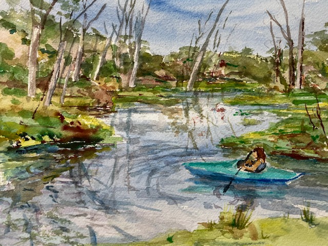 Georgine Honohan ~ Afternoon in a Kayak ~ Watercolor ~ 11×14 ~ $250 ~ Painted thinking about the peace and freshness that the Great Swamp offers to all who visit. I remembered many happy hours deep in the Swamp in a canoe, soaking up the sparkle of the water the lush green plants and the surprising joy of spotting the wildlife.