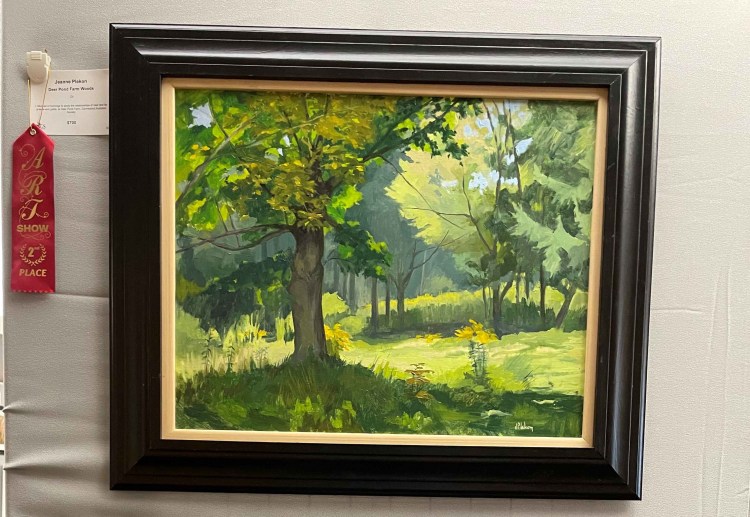 Jeanne Plekon ~ Deer Pond Farm Woods ~ Oil ~ 16×20 ~ $700 ~ I returned 4 mornings to study the relationships of near and far greens and golds, at Deer Pond Farm, Connecticut Audubon Society.