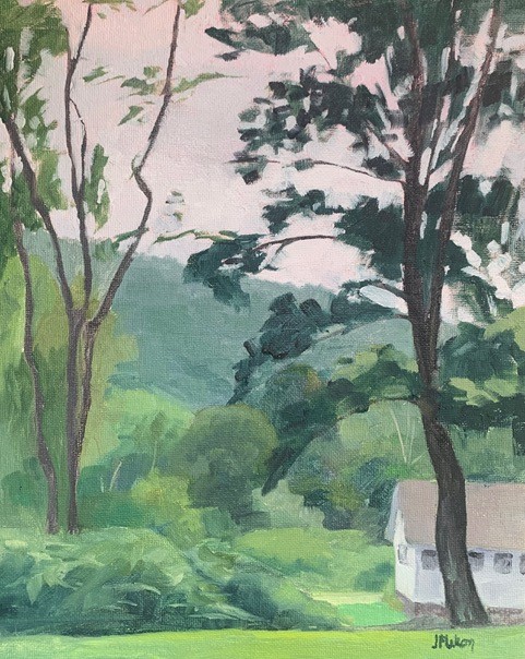 Jeanne Plekon ~ Great Hollow View Thru Trees ~ Oil ~ 8×10 ~ $250 ~ Another cloudy day, spent at Great Hollow, studying the pattern of two different tree’s branches and leaves, and the distant hill.