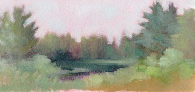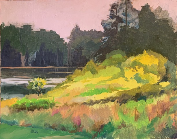 Jeanne Plekon ~ Ray Lake Late Afternoon ~ Oil ~ 11×14 ~ $450 ~ Studying the last sunshine of the day on the mid-ground while the rest of the scene starts fading to darkness, at Ray Lake, Pawling.