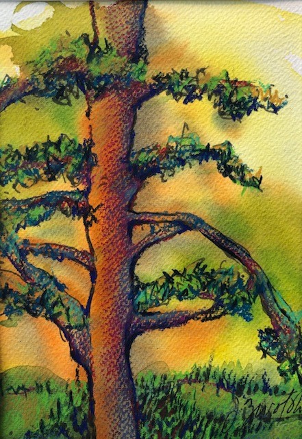 Joann Zwolski ~ Standing Tall ~ Watercolor-Pencil ~ 11.5×9.5 ~ $125 ~ When I was at the Great Hollow Preserve, the trees spoke to me. There was an abundant amount of trees that were standing strong and beautiful. I painted them again and again.